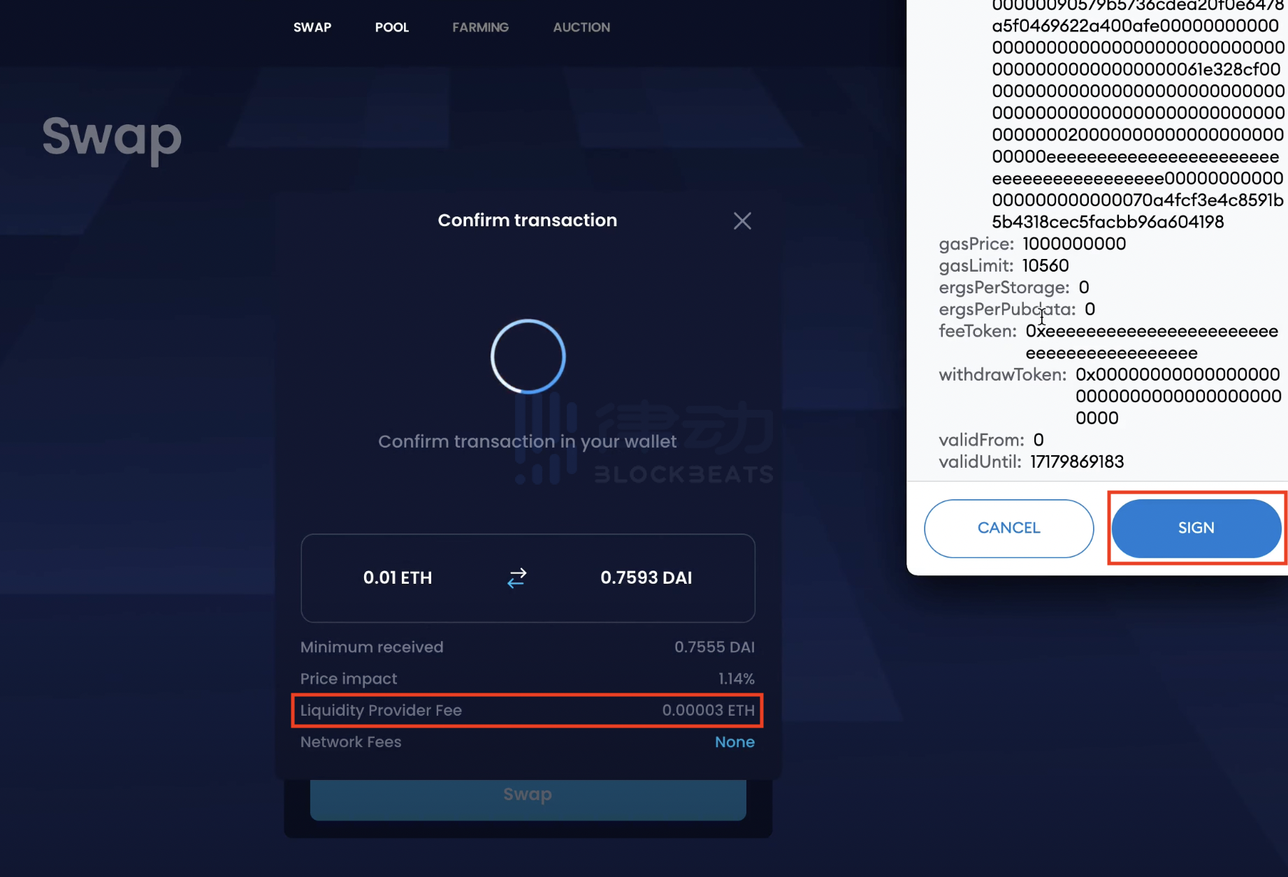 在「Swap」页面我们可以进行交易,注意这时 Metamask 弹出的不再是「Comfirm」而是「Sign」,也就是说交易并未转至以太坊主网,因此不用支付 gas,唯一需要支付的就是平台 0.0003 ETH 的手续费。