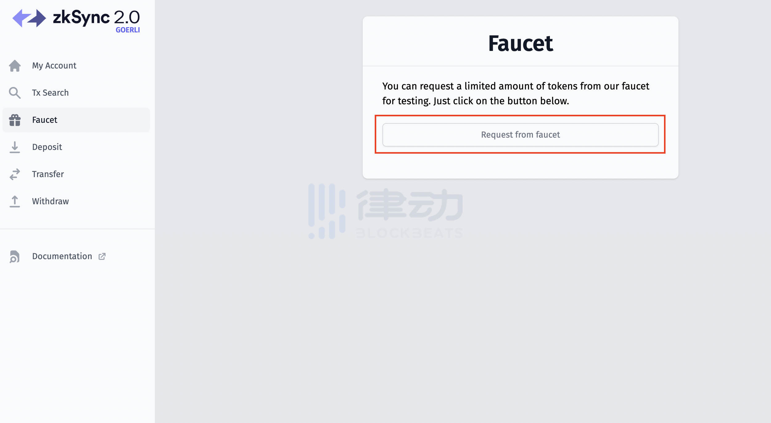 如果钱包里还没有 Goerli 测试网的 ETH Token,可以点开左侧的「Faucet」选项,在这里领取。如果因为请求过多领取不上的话,可以前往 https://goerli-faucet.mudit.blog 领取 ETH(律动注,本文中所提 ETH 均为 Goerli 测试网的 ETH Token)。