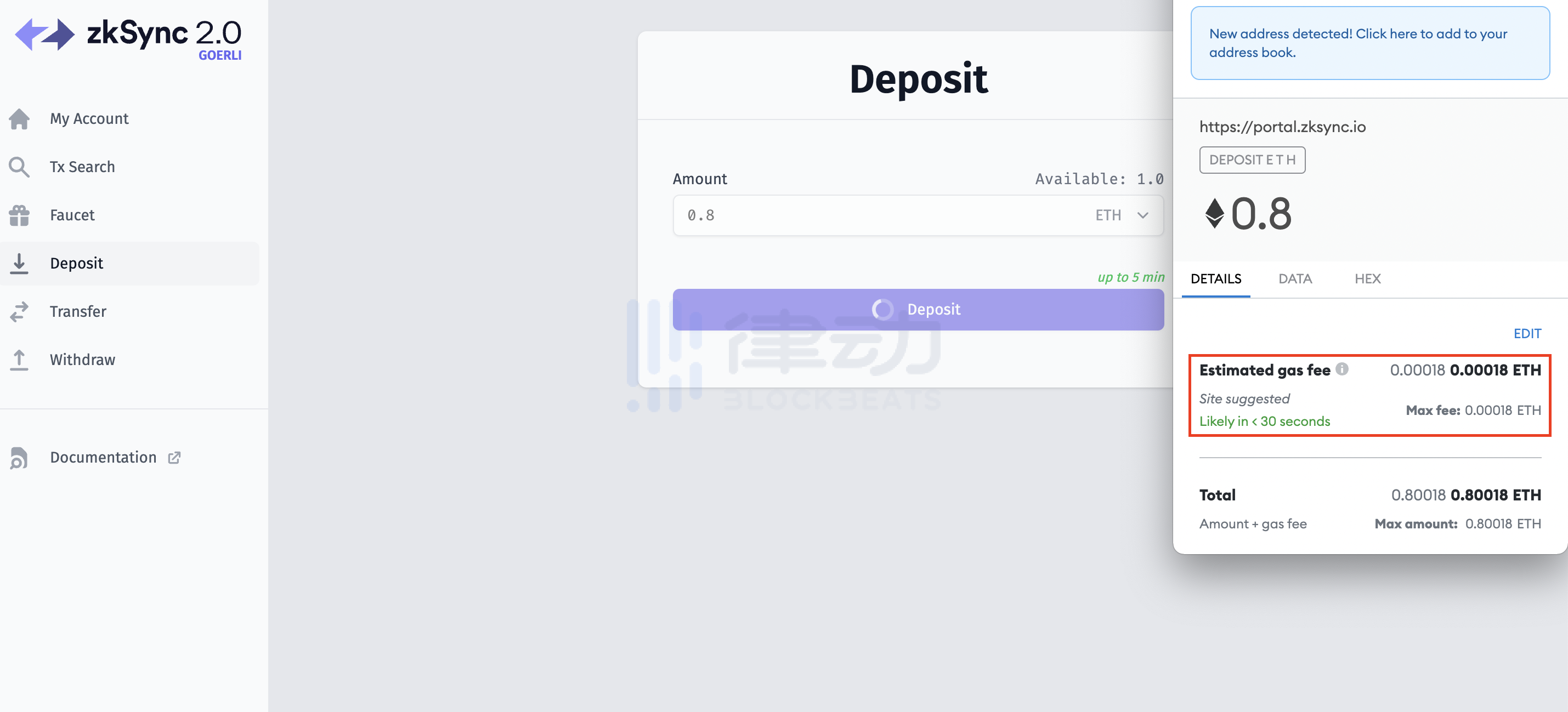 在获得 ETH 后,我们就可以来到「Deposit」选项,将其转到 zkSync 的测试网上。这个过程大概需要 1 至 2 分钟,可以看到 gas 费其实非常便宜。