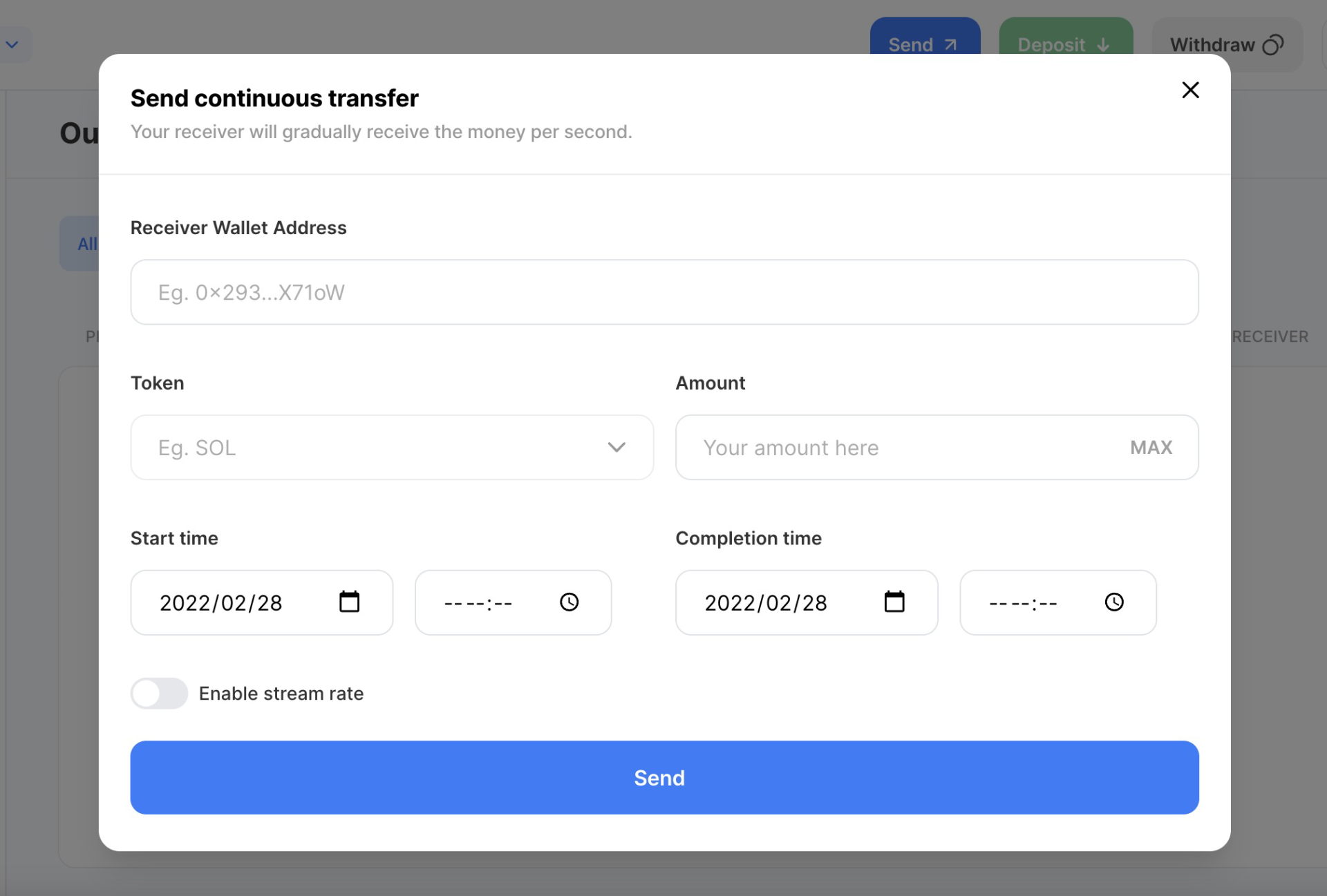 连接好钱包后,找到发送界面,输入收款人钱包地址,选择你想支付的 Token,目前这个项目仅支持 SOL、USDC、USDT 三种,输入数量,并选择开始到结束的时间段,这里的时间具体到分钟,点击 Send,它就会按照你设定的模式开始进行流支付。