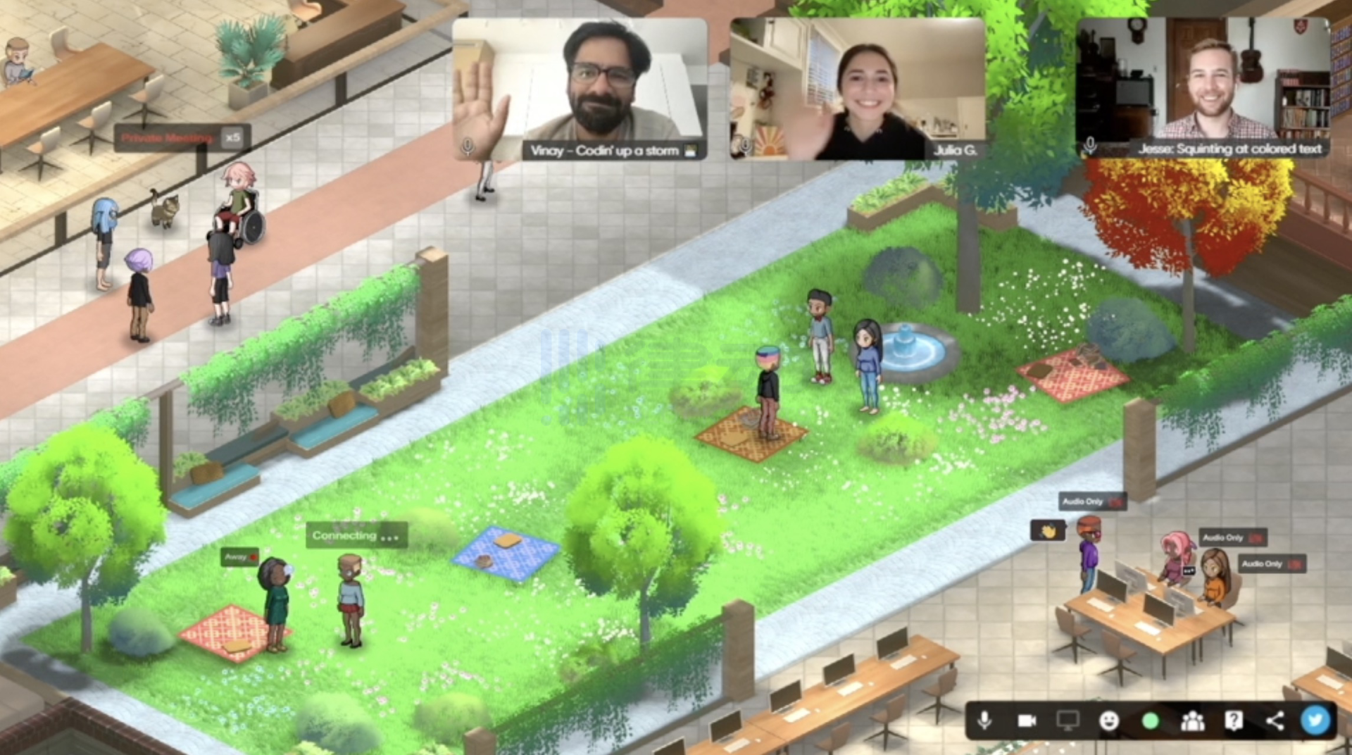 当你的办公室看起来像一个电子游戏时,的确比枯燥地面对着电脑要吸引人得多。Gather 最初于 2020 年 5 月由四个从未见过面的团队成员发起,主要希望解决「如何在线上与远方的朋友、家人保持亲密关系」的问题。也就是希望人们在虚拟世界里,也可以达到和现实世界中交互一样的效果。