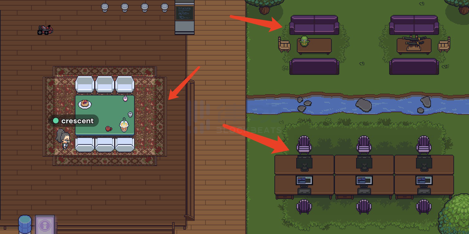 地图中还有许多私人空间,当你操纵自己的化身走进工位、会客厅等地时,周围变暗,还亮着的区域就是私人空间,在私人空间中可以与这个范围内的用户互相对话,范围外的人是听不到的。当我们想要开会时,可以一起去会议室这类大范围的私人空间进行沟通,这更像是在现实中开会的场景。