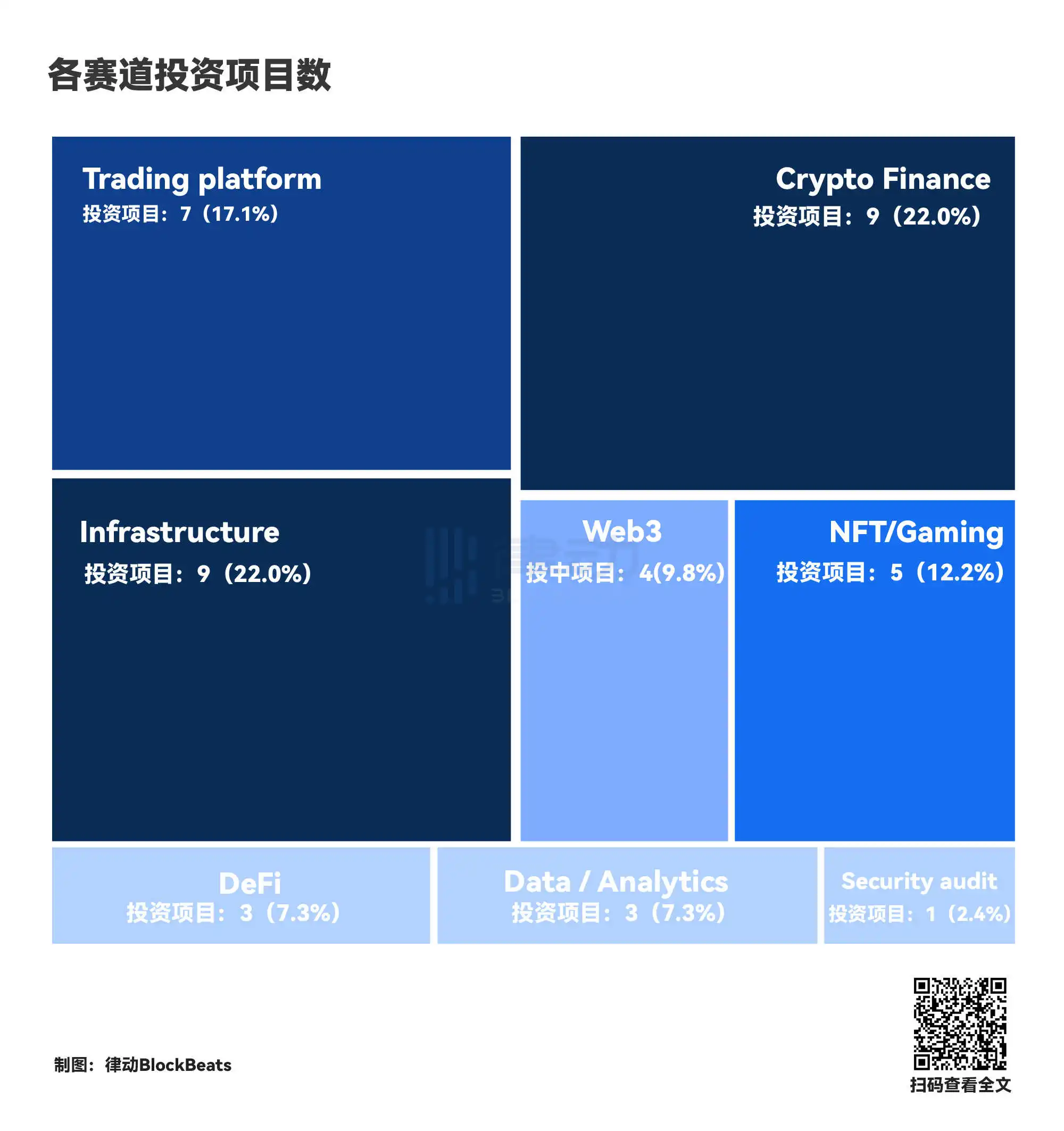 而这一现象,直到去年 4 月迎来了改变。据 Crunchbase 数据,至今 Tiger Global 在 Crypto 已投资了大约 41 个项目,累计出手 46 次,涉及到 8 个垂直领域,项目融资总额则达到了 71.7 亿美元。