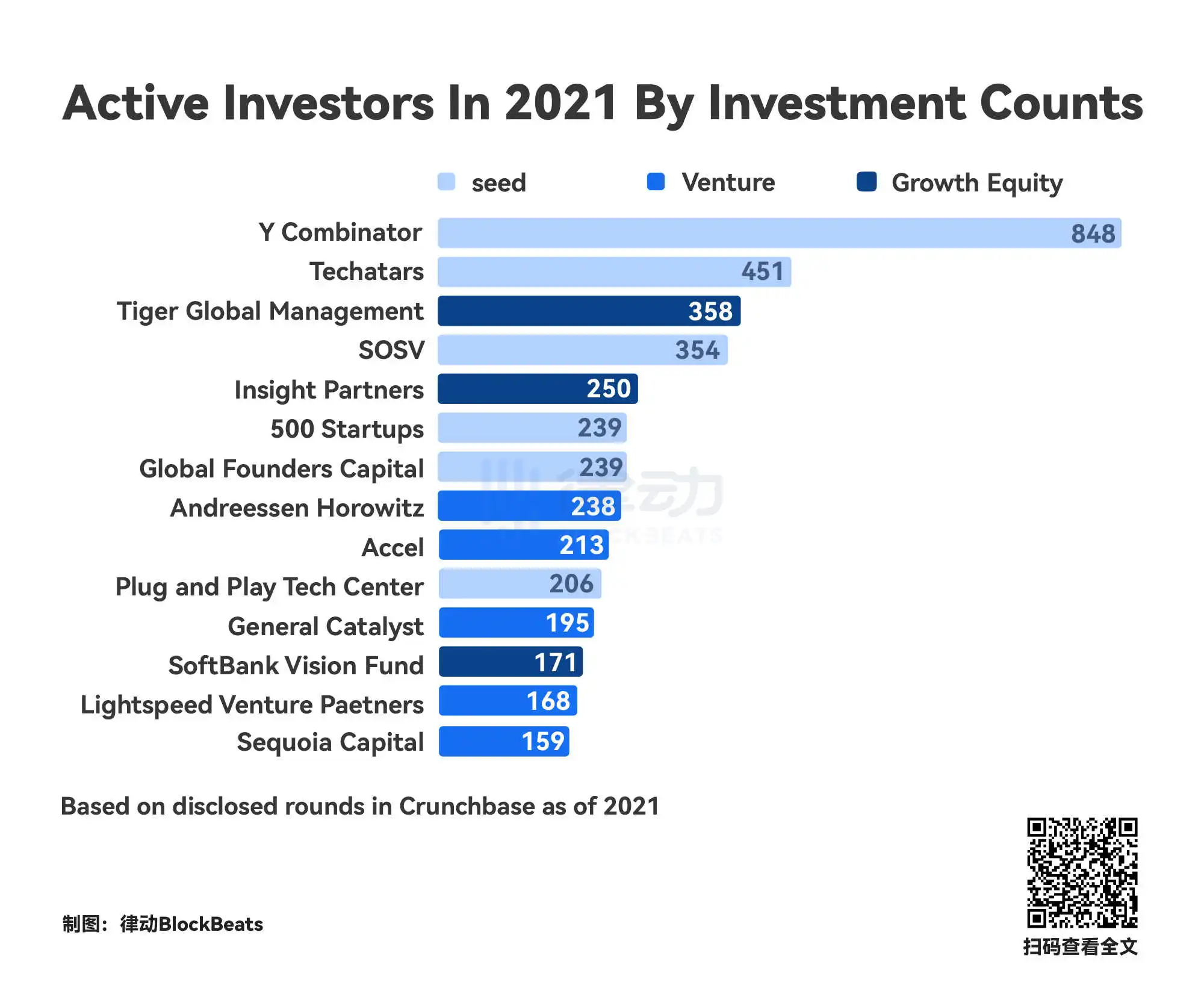 据 Crunchbase 数据,2021 年,知名对冲基金及风险投资公司 Tiger Global 参与投资的项目达到了 358 个,已远超过 a16z、红杉、光速等一众知名 VC,几乎每天都会有一笔投资交易产生。其中,领投项目更是达到 220 个,领投项目的融资总额也超过了 300 亿美元。