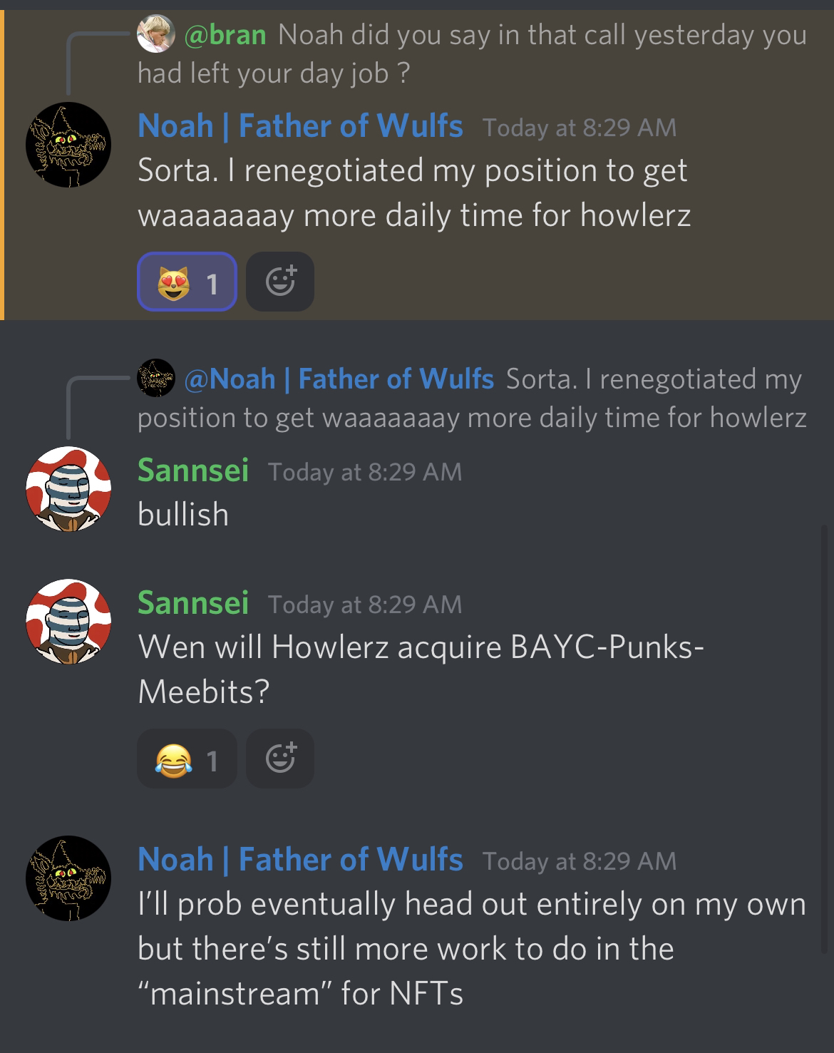 事实上,创始人 Noah 在其 token gated 的私密 discord 群里,正在对这个 NFT 项目进行紧锣密鼓的推进,包括后续第二和第三阶段游戏机制的设计,持续新增的 NFT 手绘创作,智能合约的部署、以及一周一次的抽奖活动。为了全心力致力于这个项目,Noah 甚至已申请减少自己在佳士得的工作量,以分配更多的时间分配给 Howlerz。