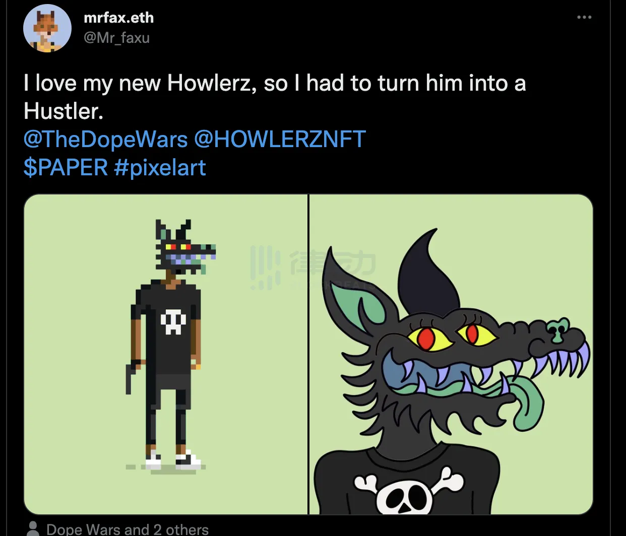 采用 CC0 模式,意味着用户可以重用该作品,在该作品的基础上自由构建其他作品,而不受版权或数据库法的限制。以下是一件将 HOWLERZ NFT 用于另一个游戏 NFT 项目 Dope Wars 中的人物角色上。由于这 2 个项目均属于 CC0 模式,因此用户可自由对其进行重混创作甚至大幅改动,生成全新的独一无二的人物形象。