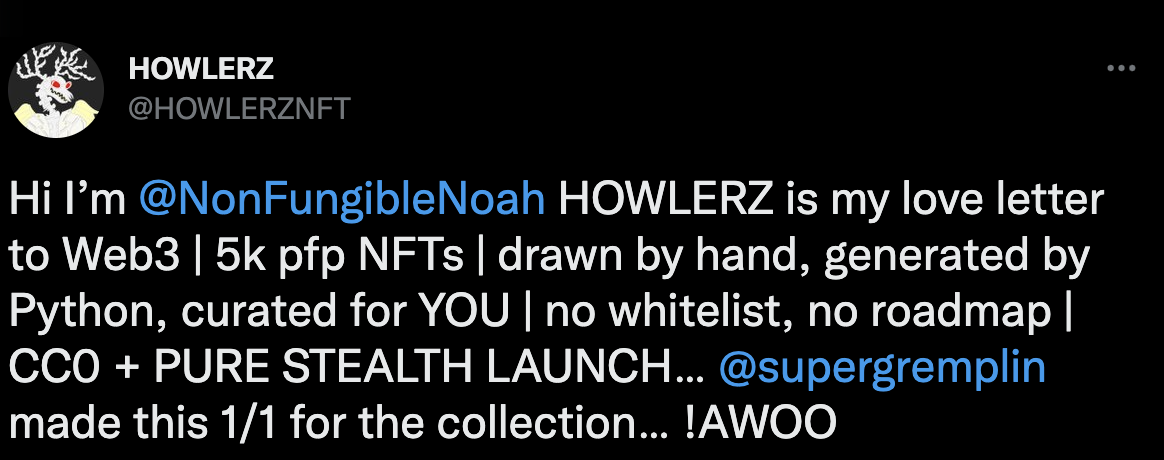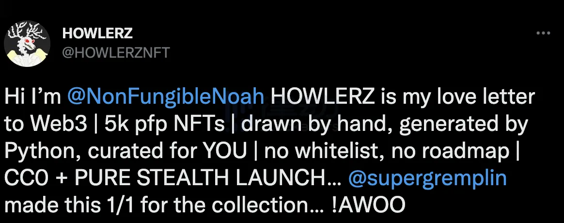 作为 Web3 精神坚实的信仰者,Noah Davis 新开的项目 HOWLERZ 采用了 CC0 许可模式,显然也在承袭这种「No Whitepaper, no roadmap, cc0, just vibe」的 Web3 精神。