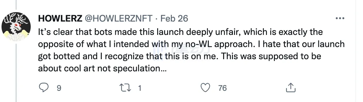 事实上,正是因为背后创作者 Noah Davis 在加密圈的影响力,让 HOWLERZ 从一开始就获得了过多的关注度,这反而让这个项目的初始发行变得没那么顺利。
