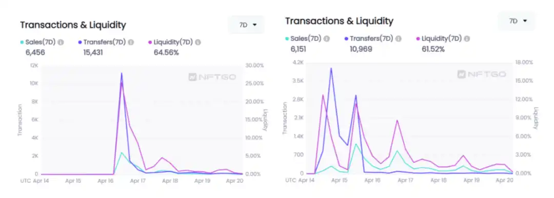 Moonbirds 的持有者达成共识更加迅速,这一行为反映在下图中,Moonbirds 流动性和交易量也从发售后迅速波动至稳定。而对比右图为同时发行的其他项目,在反映交易和流动的曲线中,所波动的时间比 Moonbirds 更长,幅度也更大,说明该项目持有人达成共识需要的时间比 Moonbirds 更久。