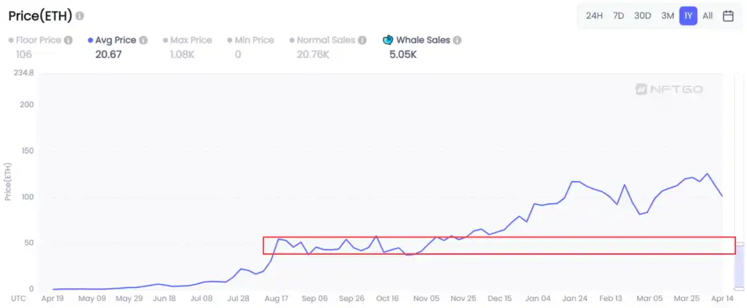 对于稳固地位的老牌蓝筹 NFT,价格下降空间很小。这是因为经历过长周期以后,这些项目的价格走势更加明晰,它们的支撑位经过多次测试更加牢固(如图 BAYC 走势),所以在熊市中人们愿意逢低购入如 BAYC 的项目。而对于可能正要成为新蓝筹的年轻项目,也会因上新项目一时爆火,受到短暂的冲击。市场体量较低时,存量资金的互流会导致项目方的优胜劣汰更加残酷。