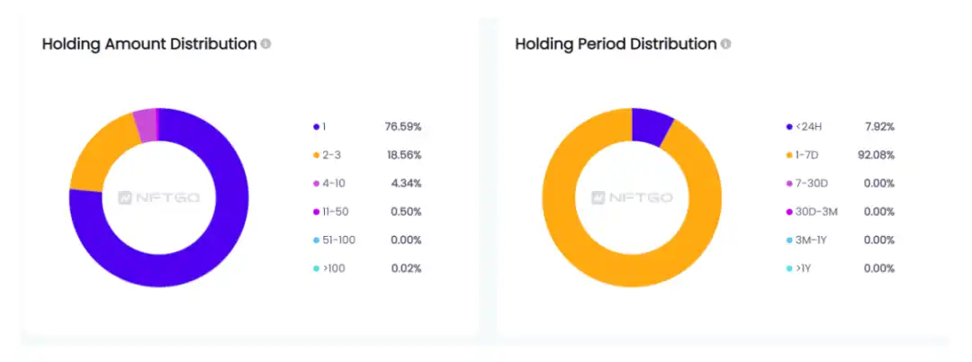 从交易数据来看,自 Moonbirds 发售结束以来,24H 内未出售的人占到了 92.8%,持有人数量进入稳定趋势,交易者数量呈指数级减少。这些数据说明绝大数购入者的目的是持有而不是直接卖掉。