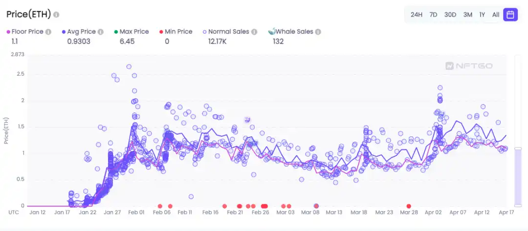 PROOF x Moonbirds 联动系统成功引燃了近期市场爆点,「铲子」类项目所占据的 NFT 市场份额正在慢慢扩大,Haus 在基于其成功孵化 Muri 与 Niwa 项目后,已从最早一月初的底部地板价格爬升至 1.2ETH 左右,从数据上的横盘期显现出其 PASS 的价值已逐步被市场认可。