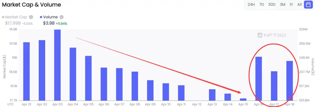 相较于前一周,NFT 市场交易量在近两日有较大反弹。