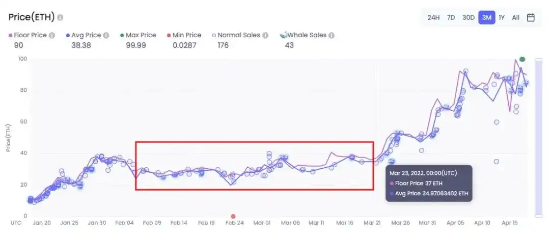 根据下图,PROOF Collective 的地板价格在 2 月初后,经历了一段明显的交易横盘期并维持在 30ETH 上下浮动。在 Moonbirds 官方推特将确凿的 PROOF 合作信息于 21 日公布于市场后,只经过了 2 天左右的平和期,3 月 23 日市场买单反应开始出现。在之后为期两周的高峰交易区间内,共有 9 个巨鲸地址购入了 PROOF 并主动在推特上进行 PROOF 社区推广与宣传。所对应 PROOF 市值的上升增幅也能表现出购买者对于 Moonbirds PFP 项目的信心程度,最终在 Moonbirds 确定其发布日前达到了 85ETH 地板价格。