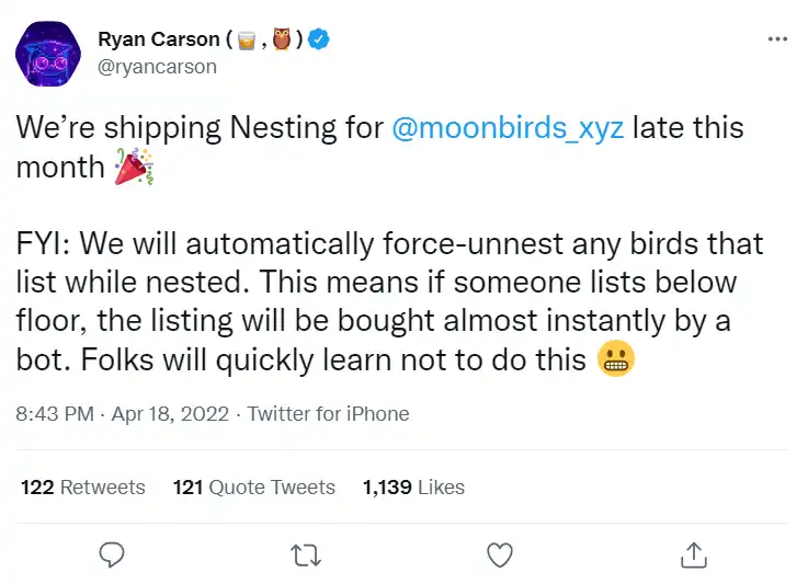 从持仓情况可以看到,绝大多数人选择继续持有而非立即出售,特别考虑到 mint 成本达 2.5E,可见持有者有较强共识。一定程度上,Moonbirds 的高 mint 成本也是对持有者的「筛选」,而 Nesting 模式也为持有者提供了一个长期持有的原因。