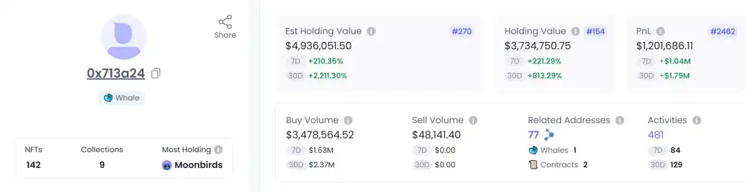Moonbirds 从 mint 价 2.5E 一路飙升到 17E 附近,根据用户画像指标,最高收益钱包的 PnL 短短几天已达到$1,201,686.11。所有发生过交易的 Moonbirds 中,已实现最高盈利的 NFT 为 #7473,其为交易者带来了 60E 的利润。