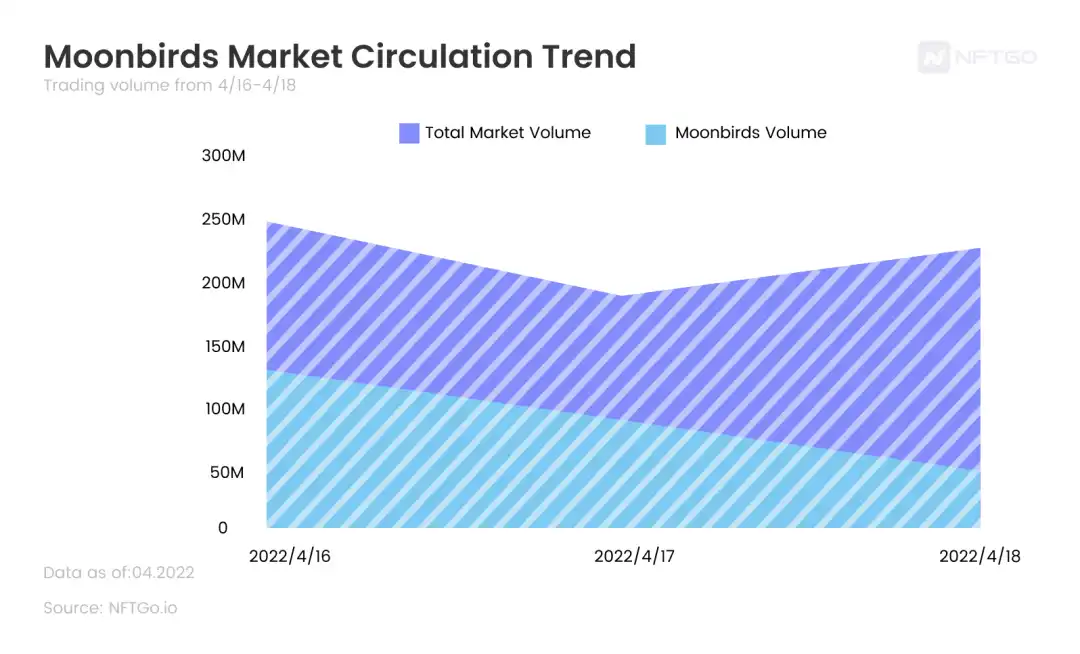 4 月 16 号,Moonbirds 发售当天,项目交易量占据了 NFT 市场总交易量的将近一半,随后两天,Moonbirds 交易量虽然开始逐渐降低,但在 4 月 18 号仍占据整个 NFT 市场交易量的五分之一。