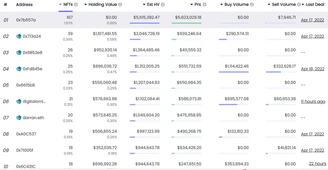 截止到 4 月 19 日,持有钱包的数量为 6634,NFT 的分布程度较高,每个地址平均仅持有 1.5 个 Moonbirds,其中持有数量前 10 名有 5 个被标记为巨鲸。