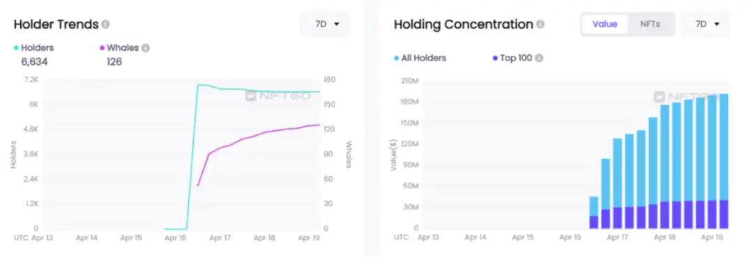 从持有者趋势图看,巨鲸在 Moonbirds 的价格上涨中起到推动作用。我们可以看到,从 4 月 16 日发售结束后,NFT 的持有者有微小程度的下降,但巨鲸数量一直在增长。