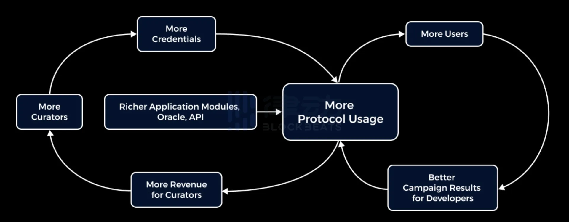 使用策展人提供的数据可以使策展人得到回报,在一定程度上激励更多策展人参与,这又会增加 Project Galaxy 的信息覆盖范围,促使其 Web3 凭证数据网络更加强大,吸引更多的开发者使用该网络数据,形成一个正向循环。