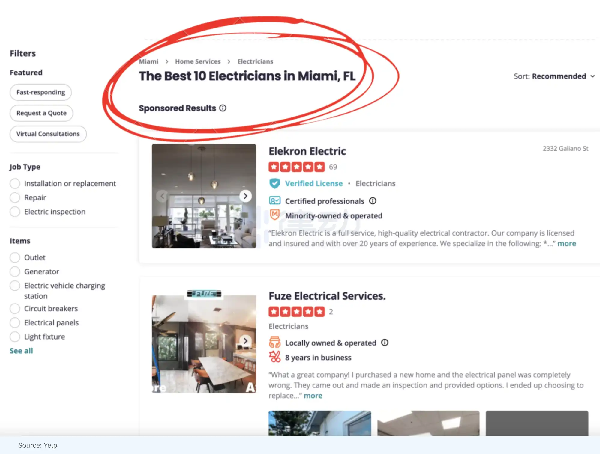 在 Yelp 上,搜索 "迈阿密的电工",一开始就有一个名为 "佛罗里达州迈阿密最好的 10 名电工 "的页面,下面的文字显示,这些结果大多是付费推广的。