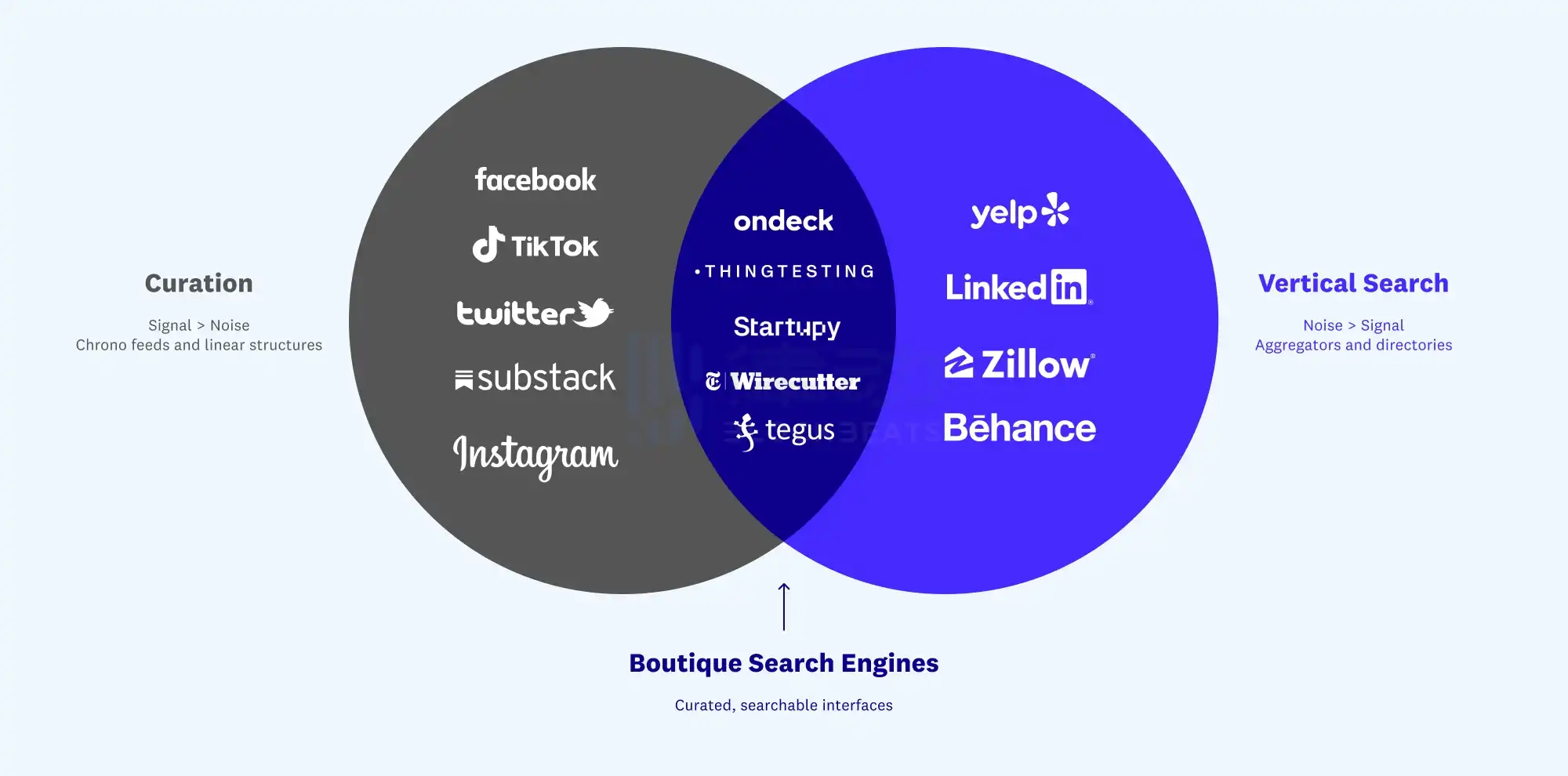应用 Ben Evans 的框架,很明显,虽然垂直搜索的参与者已经变得太大,需要策划,但策划的 Feed 已经变得太长,无法浏览,需要搜索和结构化数据。解决方案是更好的搜索和更好的策划,所有这些都被包裹在一个更好的商业模式中--我称之为精品搜索引擎的组合。