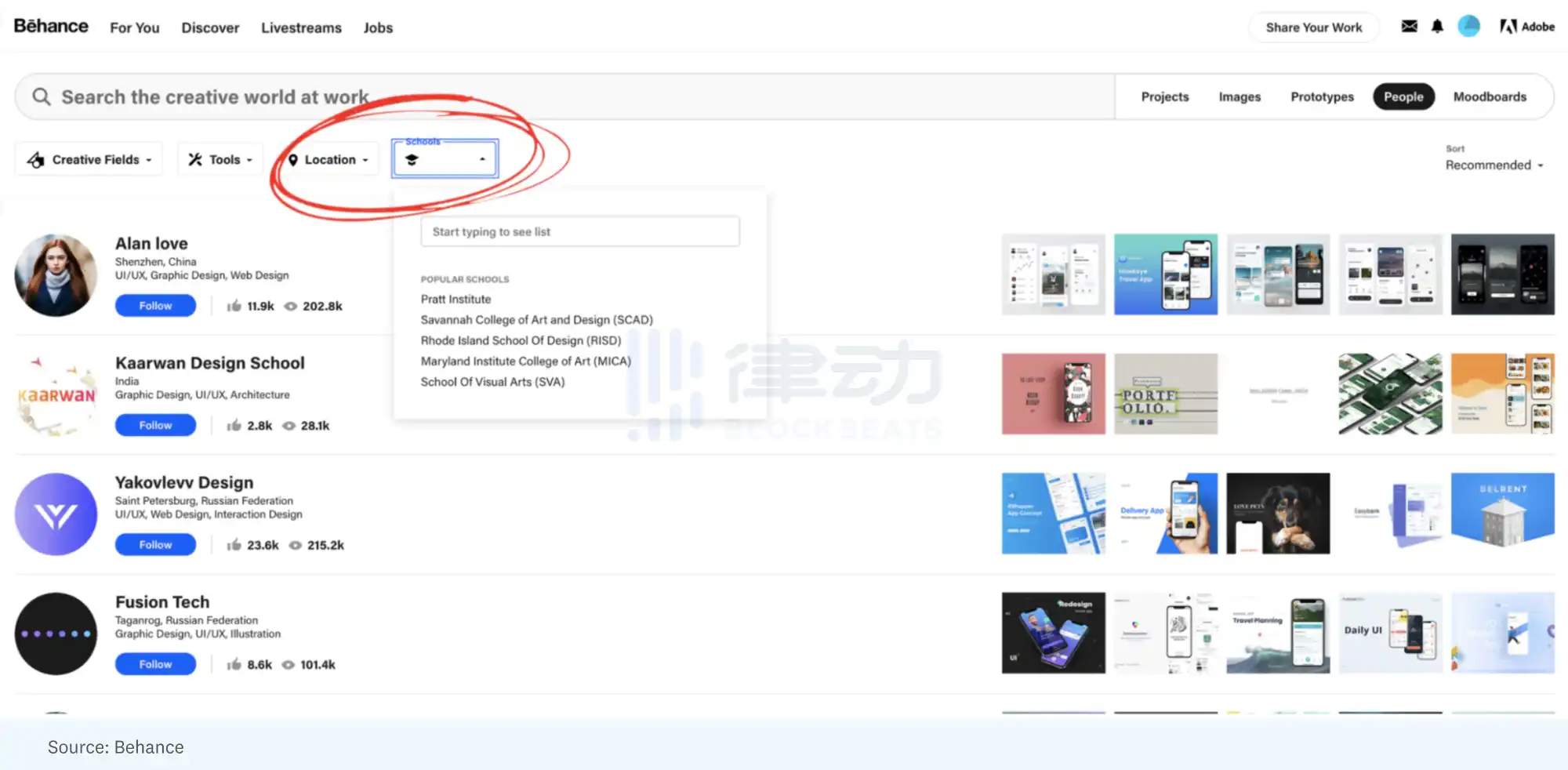 随着这种需求趋势的发展,出现了新的索引方式和表面的创新点。如果 Behance 是今天设计的,我认为 "地点 "和 "学校 "都不会成为过滤器。