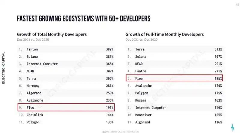 上述数据整理自多个平台的开源存储库和代码提交,包括 GitHub、Gitlab、CoinGecko 和 DappRadar。2021 年,在拥有 超过 50 名开发者的公链中,Flow 的增长速度排名第九,如果只考虑全职开发人员,Flow 生态增长速度排名第五。