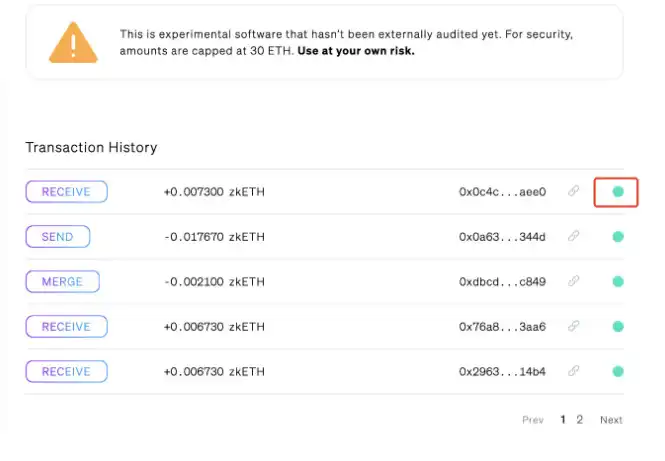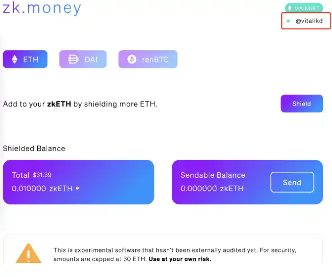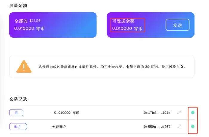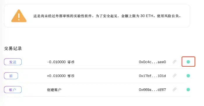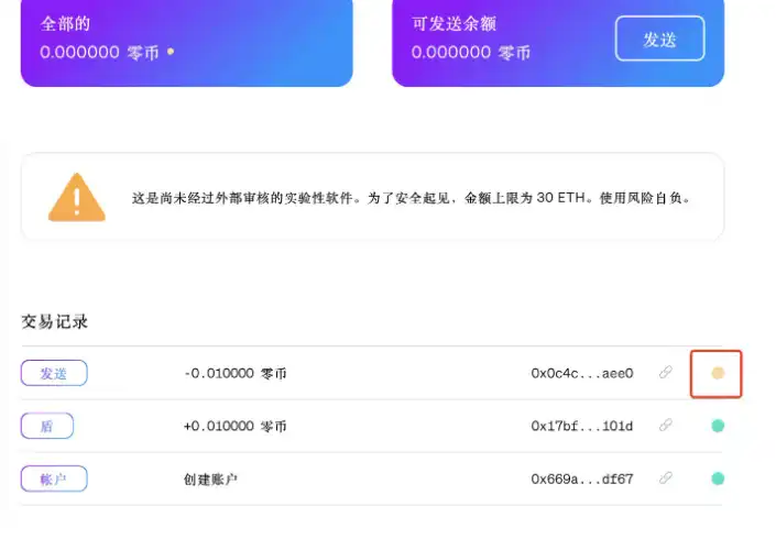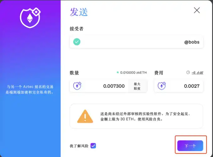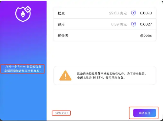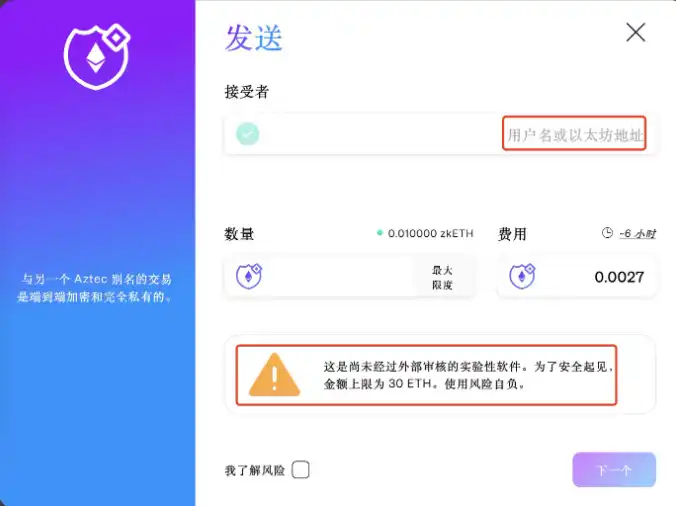 接受者可以填写用户名或者以太坊地址都可以。然后注意黄色的警告,软件尚未审计,金额上限为 30 ETH,风险自担。