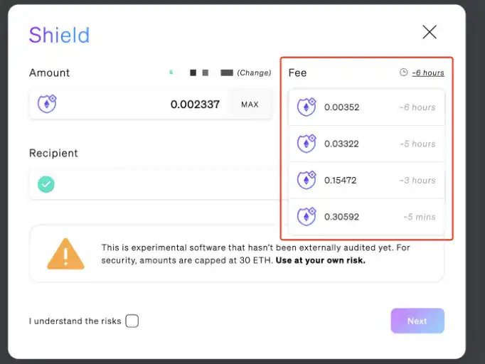 还有一点注意一下,我们每次在 Shield 或者 Send 的时候,都可以自己选择 Fee,Fee 越高交互过程越快。