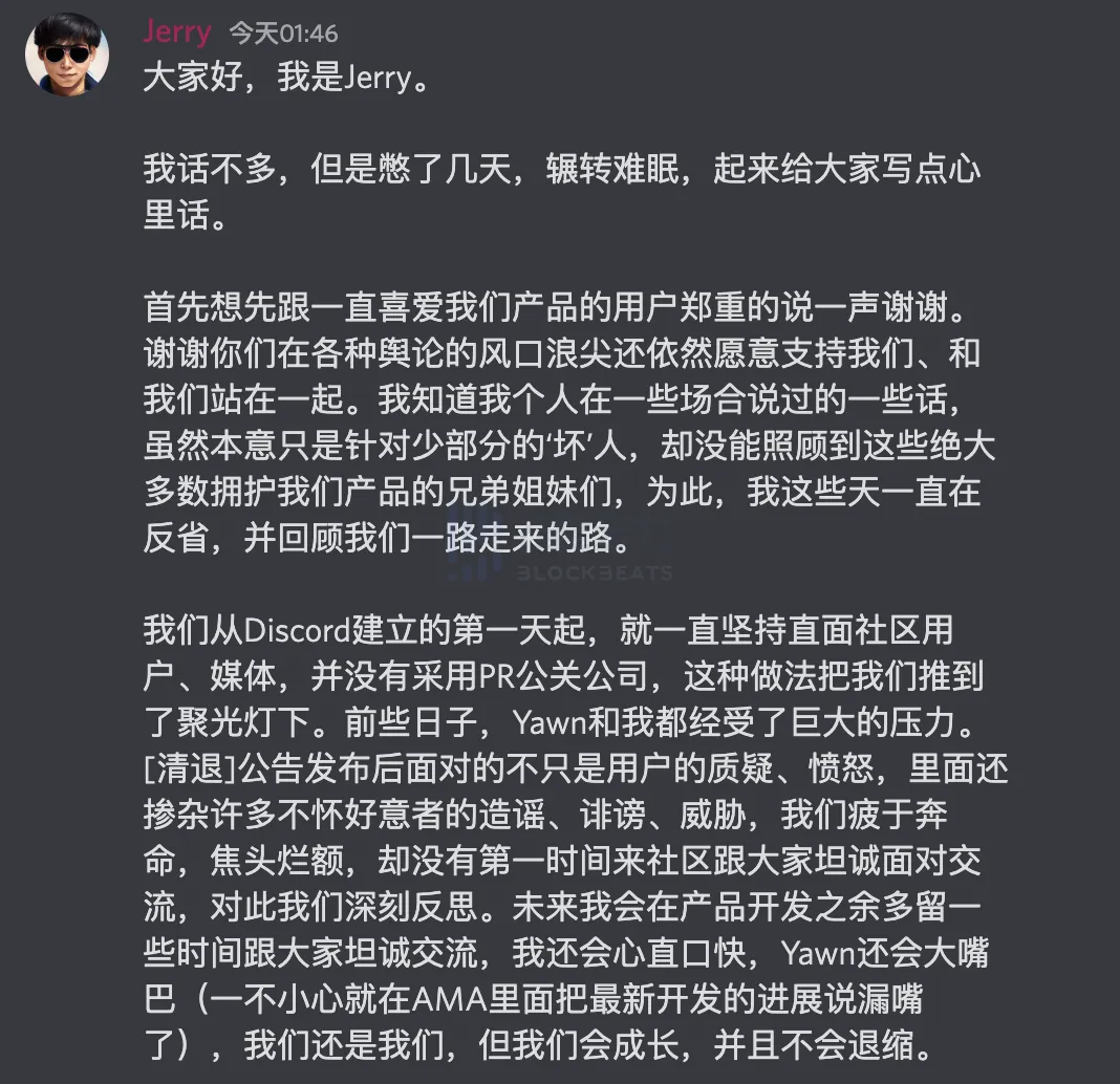 我们从 Discord 建立的第一天起,就一直坚持直面社区用户、媒体,并没有采用 PR 公关公司,这种做法把我们推到了聚光灯下。前些日子,Yawn 和我都经受了巨大的压力。[清退] 公告发布后面对的不只是用户的质疑、愤怒,里面还掺杂许多不怀好意者的造谣、诽谤、威胁,我们疲于奔命,焦头烂额,却没有第一时间来社区跟大家坦诚面对交流,对此我们深刻反思。未来我会在产品开发之余多留一些时间跟大家坦诚交流,我还会心直口快,Yawn 还会大嘴巴(一不小心就在 AMA 里面把最新开发的进展说漏嘴了),我们还是我们,但我们会成长,并且不会退缩。