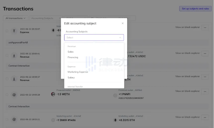 在「Transactions」页面中,可以看到项目的收支明细,同时也可以针对单笔交易进行标签改动。譬如,团队用广告运营的钱包为员工发放了薪酬,便可以在「Edit accounting subject」中将该交易从「广告支出」修改为「员工薪酬」。