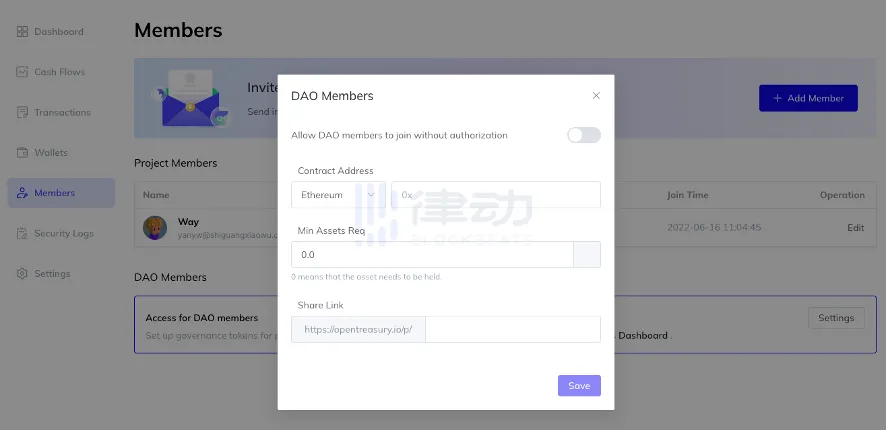 而针对 DAO 组织,Open Treasury 还提供了向 DAO 社区和成员进行财务披露的功能。在「DAO Members」部分点击「Setting」,就可以对 DAO 成员的身份验证设置自定义标准,例如持有一定数量 Token 或 DAO 项目的 NFT 等,以便向通过资格验证的 DAO 成员分享财务信息。
