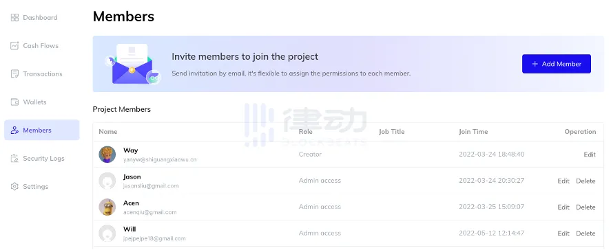 在「Members」页面,团队可以根据自己的需求,为项目的财务设置访问权限,并基于邮箱将财报内容分享给项目合伙人以及投资者。而作为投资方,则可以一站式、清晰地查看和分析所投项目的健康程度和发展状态。