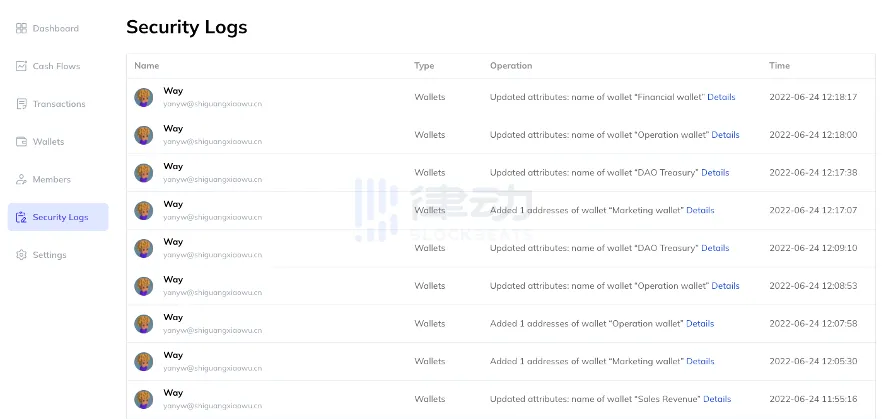 最后在「Security Logs」页面中,可以看到团队涉及财务安全的操作记录。许多 Web3.0 团队大都管理着多个钱包地址,很难关注到每个操作细节,因此对于一些风险的交易,比如添加或删除钱包地址、未计入项目收支的空投资产等,Open Treasury 都会自动存储在中心化的服务器中,未来这些数据则会直接上链。