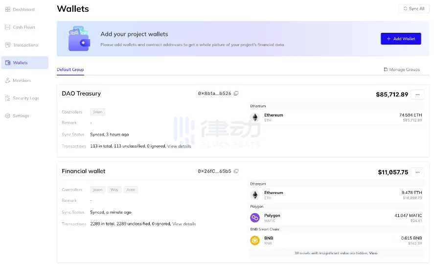 在「Wallets」页面中可以添加项目钱包,并批量或为单个钱包做标签备注。在为项目钱包做好标签备注后,Open Treasury 便会自动为项目所有日常交易进行汇总与整理。