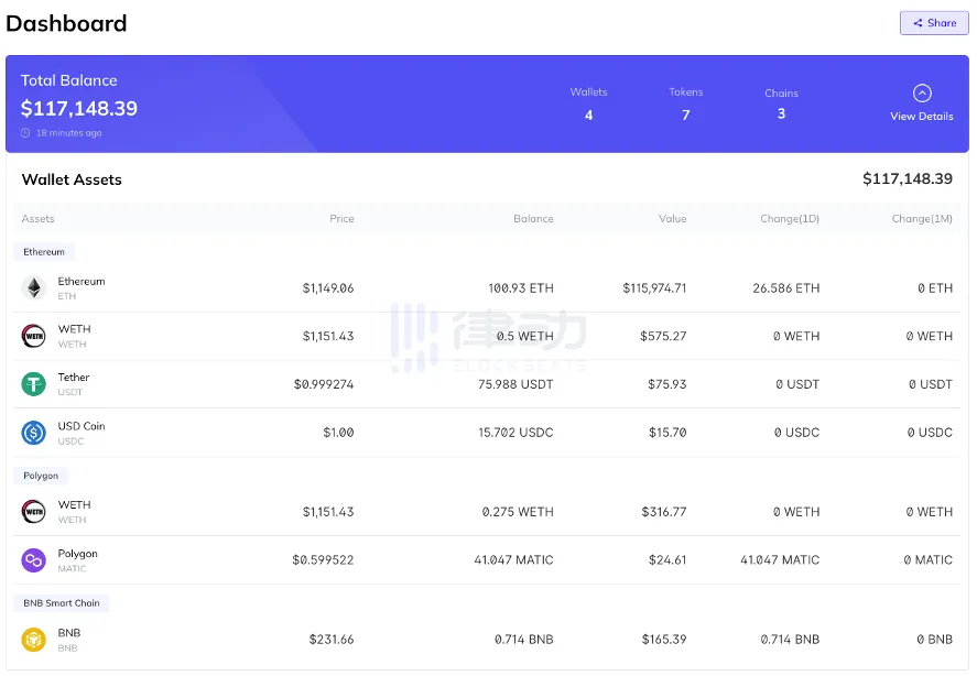 首先,用户能在「Dashboard」页面看到项目整体的资产组合与分布,以及各资产的日或月变动额。
