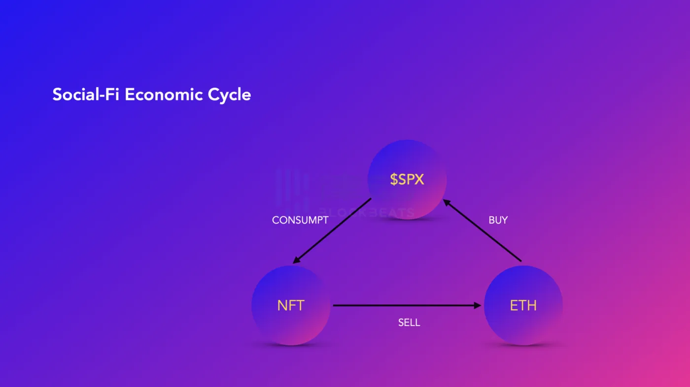 在第二个循环周期中,使用的是治理 Token SPX,SPX 总量共有 10 亿枚,主要用于 SocialFi 系统,这个系统有别于其他币圈固有项目之处就在于它构造了一个开放性系统,突破了 P2E 的封闭性。