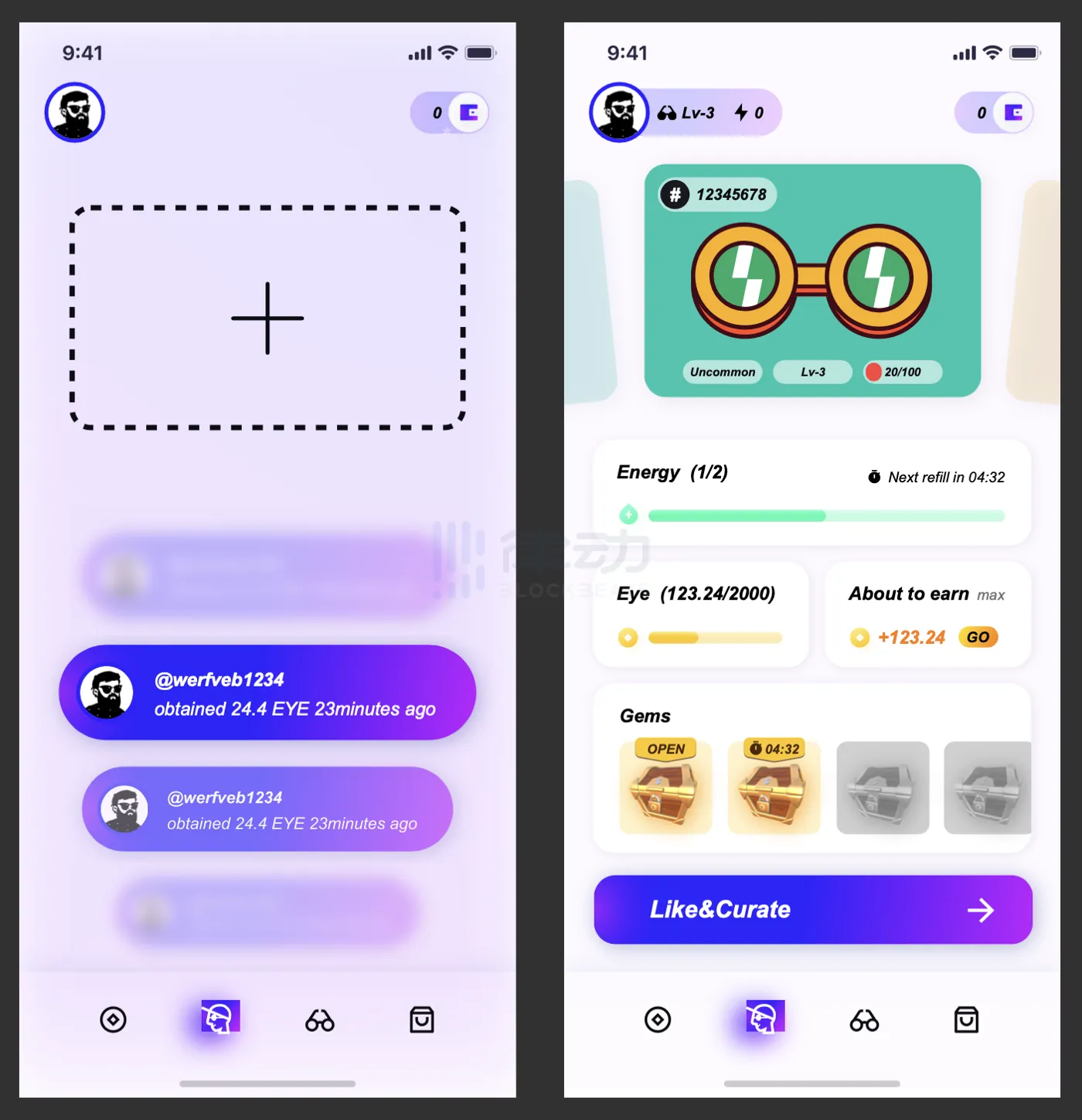 在该项目具体实施的过程中,每⽇能量、每日 Token 皆有上限,当然玩家还可通过获得更多的眼镜来增加能量上限,通过提升眼镜等级来提⾼每⽇获取 EYE 的上限。这也促使用户将自己的策展或点赞行为放在自认为具有最高价值的 NFT 上,为自己带来更多收益。