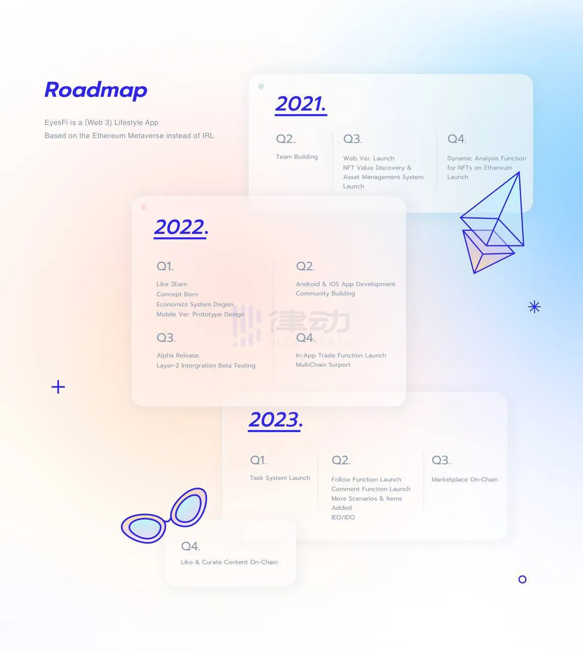 如其路线图所示,该团队始于 2021 年 Q2 建立,Q3、Q4 启动网页版 NFT 价值发现和资产管理系统,并上线了 NFT 动态分析功能。在今年上半年,诞生了 Like to Earn 概念,围绕其设计了项目经济体系,开发了手机版 Android 和 IOS 应用程序,及建设社区。