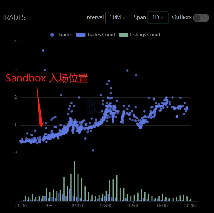 Sandbox 入场的消息在各个社区传播,让市场变得 FOMO 起来了,随后价格一路飞涨,地板价格从当时的 0.45 ETH 一路飞涨至最高 1.8 ETH 左右。