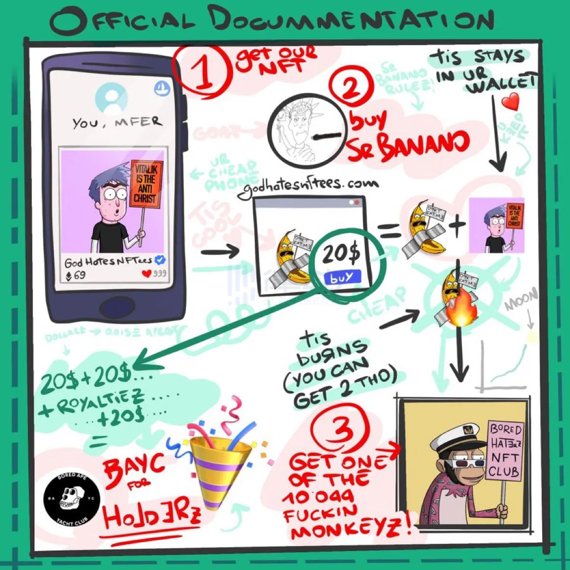 独树一帜的社区文化、「病毒式」传播的 Meme、与 KOL「蹭热度」,God Hates NFTs 靠着娴熟的炒作与营销手法快速地在 NFT 市场里站稳了脚跟。