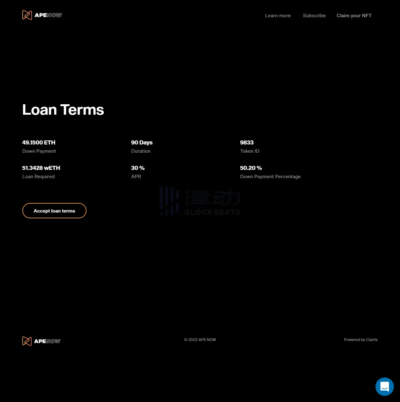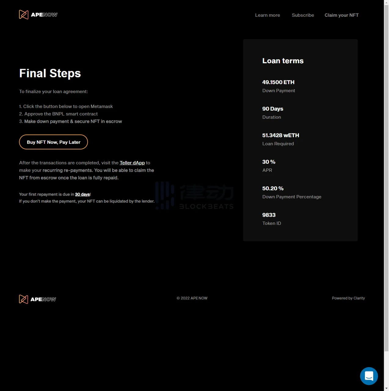 Ape Now 是一个建立在 DeFi 借贷市场 Teller 上的 NFT 分期购买协议,用户在购买蓝筹 NFT 时可以先支付一笔首付,剩余款项可以分期支付,在没有完成全额支付前,NFT 会被平台托管,支付完成后用户才可以将 NFT 提取到自己的钱包中,而如果用户没有按照约定期限完成分期付款,NFT 将会被清算并补偿给贷款提供方。