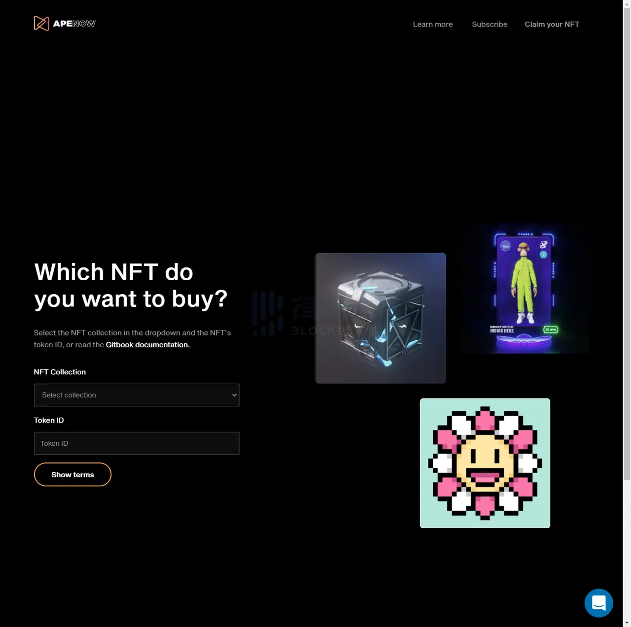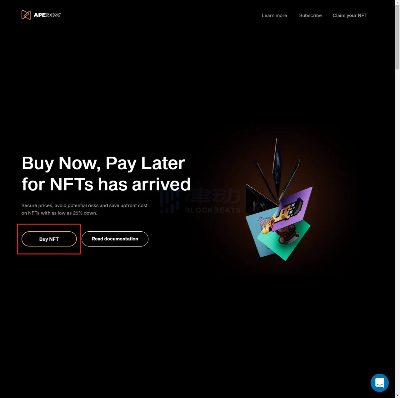 首先前往项目官网:https://apenowpaylater.com/ 并点击 Buy NFT