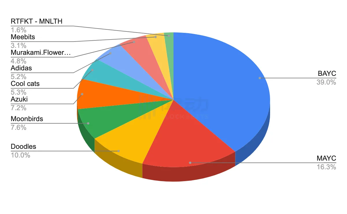 在 Ape Now 上线的一周时间里,共有超过 600 笔分期购买订单,购买各个蓝筹 NFT 项目的比例如下: