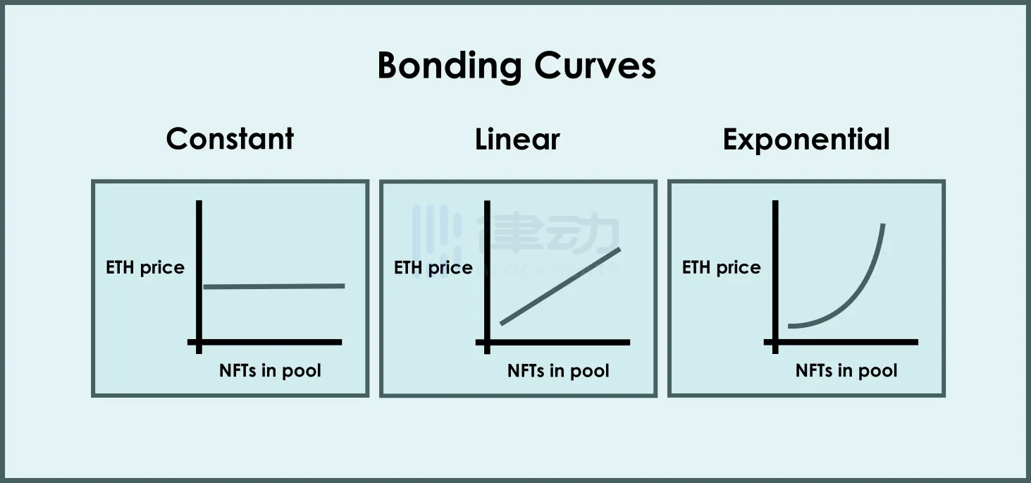 但 uniswap 采用 x*y=k 恒定乘积算法并不适用于 NFT 市场,本质上是因为 NFT 与 FT 的交易市场天然的结构不同。NFT 的总量在 10,000 以下的项目最为常见,而 FT 的数量则动辄以亿为单位,数量悬殊导致了 NFT 交易市场的深度明显不足。因此 sudoAMM 采用了联合曲线(线性和指数)来促进 NFT 的交易,自动调整买卖双方的报价提高了交易者和流动性提供者的灵活性。