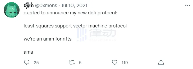 2021 年 7 月 10 日,0xmons 宣布他开发了一个名为 LSSVM 的 NFT 流动性提供协议,并发布了最初的白皮书《LSSVM:NFT 的流动性提供协议》简单介绍了这个 NFT AMM 的基本思想。