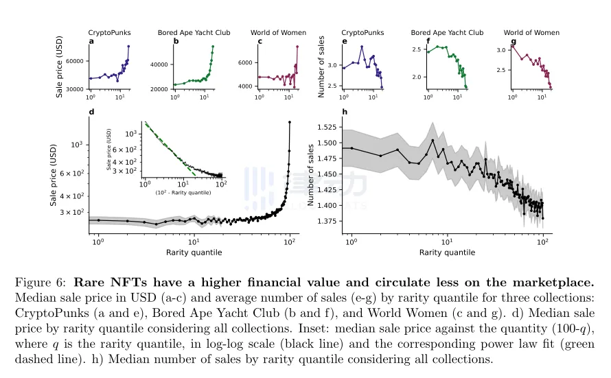 实际上,在今年 4 月份伦敦大学的一篇研究论文《稀有度如何塑造 NFT 市场》中表明,综合市场上主流的 NFT 系列,长期来看那些属性普通的 NFT 在二级市场上的交易情况相对稀有的 NFT 更加统一,市场似乎认为它们基本上是「可替代的」。对于那些属性稀有的 NFT,研究也表明它们的交易次数会随着稀有度增高大幅度下降。