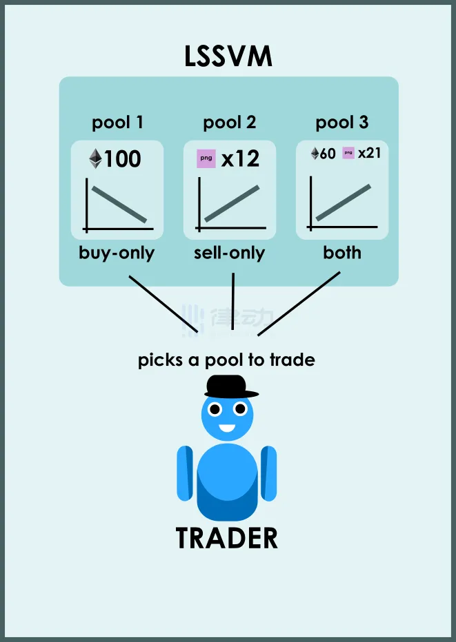 LSSVM 是一个为 NFT 创建自定义 AMM 的协议,它由许多单独的 NFT 的流动性池 (pool) 组成,每一个 pool 由一个流动性提供者来管理。