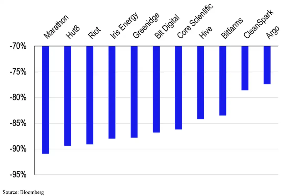 在二级市场上的表现也尤为突出,在美国上市的加密采矿公司,如 Riot Blockchain Inc. 和 TeraWulf Inc. 在今年分别下跌 78% 和 89%,在多伦多上市的 Hut 8 Mining Corp. 下跌 79%,Bitfarms Ltd. 下跌了 71%。投资者一直在抛售这些股票,以应对加密货币采矿公司的利润下降和高固定成本。虽然挖矿市场在算力方面可能仍远未达到均衡,但最近几个月矿商出售和关机活动的证据已开始以网络算力下降和最终挖矿困难的形式表现出来。如果这些下降趋势继续下去,根据 2018 年加密货币寒冬观察到的趋势和经验来判断,当前的情况距离熊市的底部会越来越接近。